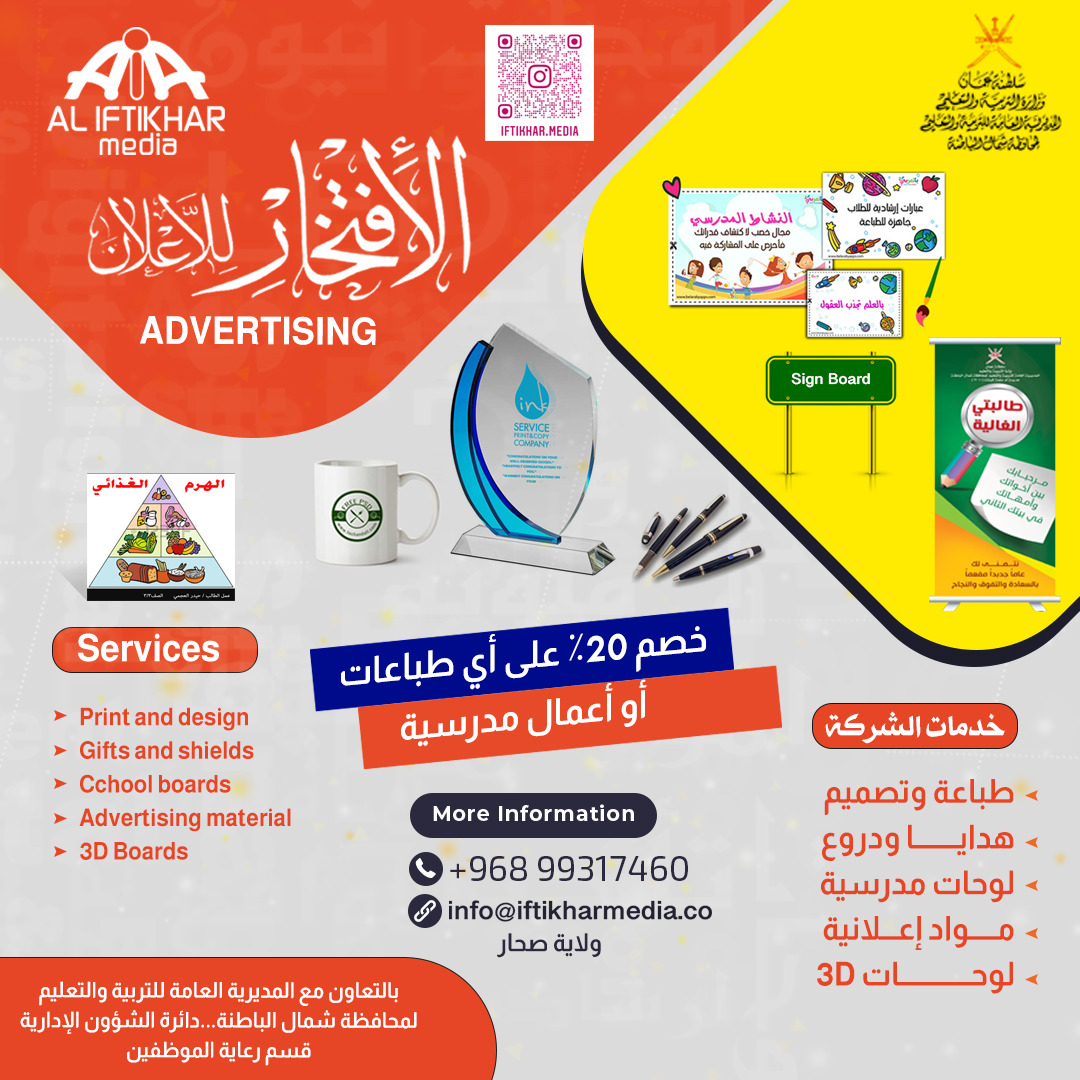 •  اتفاقية لتمويل شاشة عرض لمسرح المديرية العامة للتربية والتعليم بجنوب الباطنة