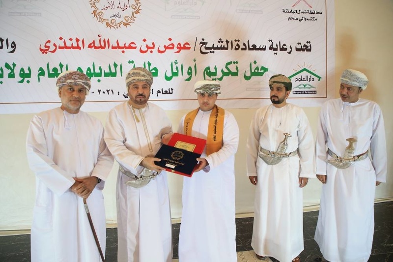 تكريم أوائل طلبة دبلوم التعليم العام في صحم احتفلت ولاية صحم ممثلة بمجلس أولياء الأمور بتكريم أوائل طلبة دبلوم التعليم العام، وذلك برعاية سعادة الشيخ عوض بن عبدالله المنذري والي صحم ورئيس مجلس أولياء الأمور بالولايةـ، وبحضور المهندس ناصر بن سعيد المعمري رئيس مجلس إدارة مجموعة دار العلوم وأعضاء مجلس الشورى، وبحضور أحمد بن ... المزيد