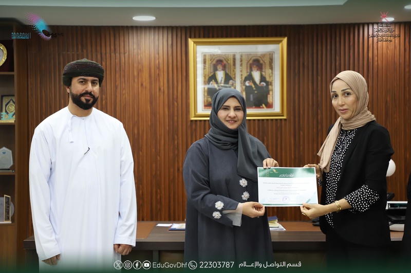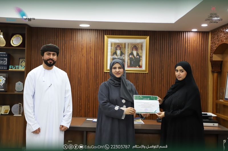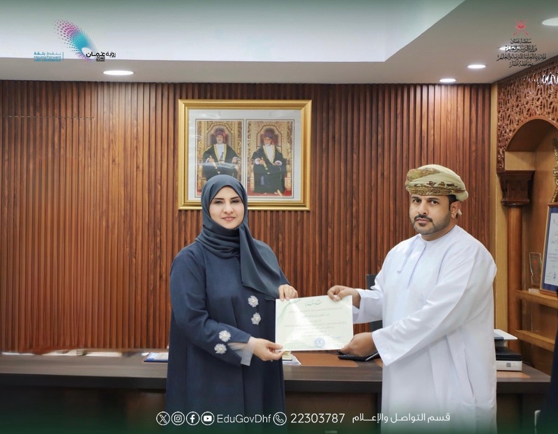 من جانبٍ آخركرّمت المديرة العامة للمديرية العامة للتربية والتعليم بمحافظة ظفار، موظفي قسم التواصل والإعلام بالمديرية، وذلك تقديرًا وتثمينًا لجهودهم الواضحة خلال العام الدراسي 2024 / 2025م، في التغطيات الإعلامية لمختلف فعاليات الأقسام الإدارية ودوائر المديرية، وكذلك مكاتب التربية والتعليم في ولايتي رخيوت وثمريت، إضافةً إلى إدارتهم الفاعلة للمنصات الإخبارية والحسابات الرسمية للمديرية، إلى جانب دورهم في تفعيل وتنفيذ مهام وأعمال اللجنة الإعلامية في الاحتفالات الرئيسية التي نظّمتها المديرية، مما أسهم في إبراز جهود تعليمية ظفار إعلاميًّا بصورة مهنية وهادفة.