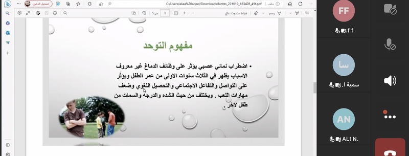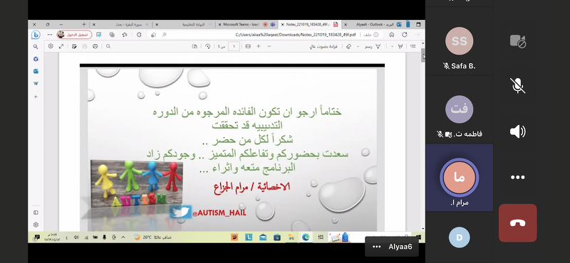 واستهدفت المحاضرة والتي تم تنفيذها عبر الاتصال المرئي مشرفي ومعلمي برامج صعوبات التعلم، الدمج الفكري، و أخصائي النطق والتخاطب، و أخصائي إضرابات طيف التوحد. بالإضافة إلى أولياء الأمور.