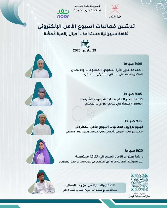 تُدشن المديرية العامة للتعليم بمحافظة جنوب الشرقية يوم غدٍ الأحد، الموافق 29 مارس 2026، فعاليات "أسبوع الأمن الإلكتروني" تحت شعار "ثقافة سيبرانية مستدامة.. أجيال رقمية مُمكنة"، وذلك برعاية الفاضل عبدالله بن علي بن سالم الفوري، المدير العام للمديرية، وبمشاركة واسعة النطاق من مدراء ومديرات الدوائر، ومدراء ومديرات ... المزيد