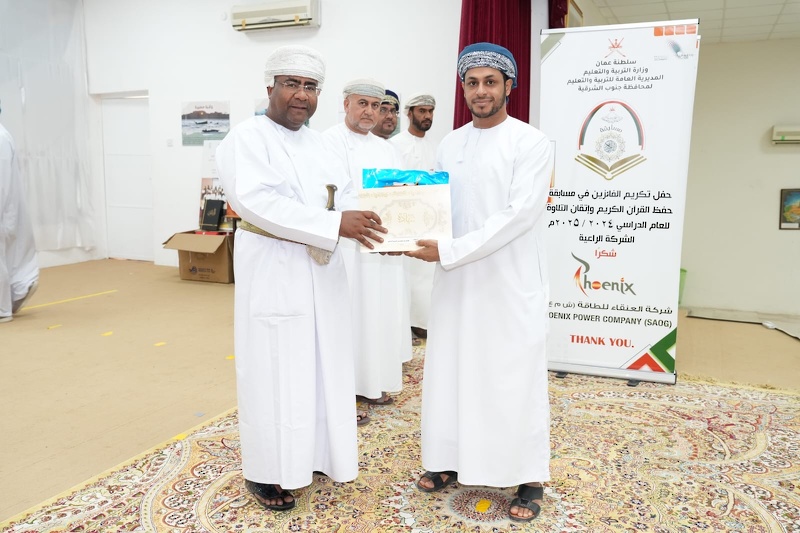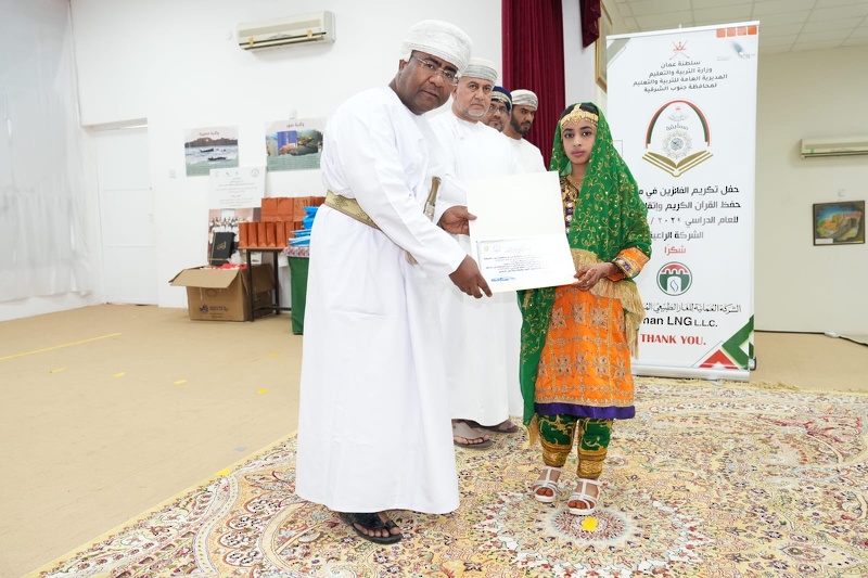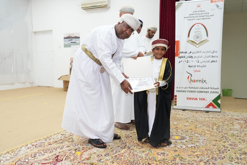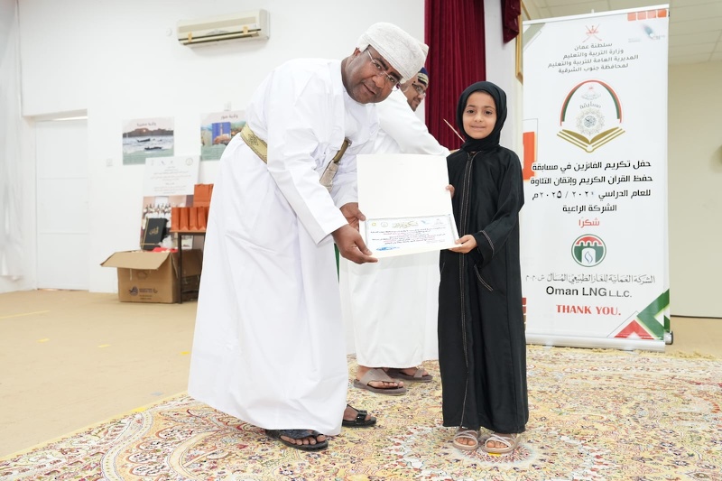 احتفلت المديرية العامة للتربية والتعليم بمحافظة جنوب الشرقية ممثلة بدائرة الإشراف التربوي اليوم الأربعاء بتكريم الطلبة الفائزين في مسابقتي حفظ وإتقان تلاوة القرآن الكريم للعام الدراسي 2024/ 2025م وذلك تحت رعاية عبدالله بن علي الفوري مدير عام تعليمية جنوب الشرقية وبحضور مديرو العموم المساعدين ومديرو ومديرات دوائر المديرية ومديرو ومديرات المدارس وممثلي الشركة العمانية للغاز الطبيعي المسال وشركة العنقاء للطاقة الشركات الداعمة للمسابقة وعدد من المسؤولين التربويين وأولياء الأمور والطلبة والطالبات وذلك بمسرح مدرسة الوافي