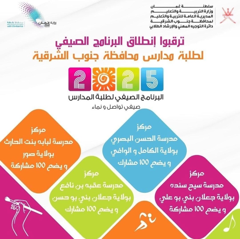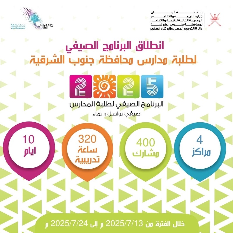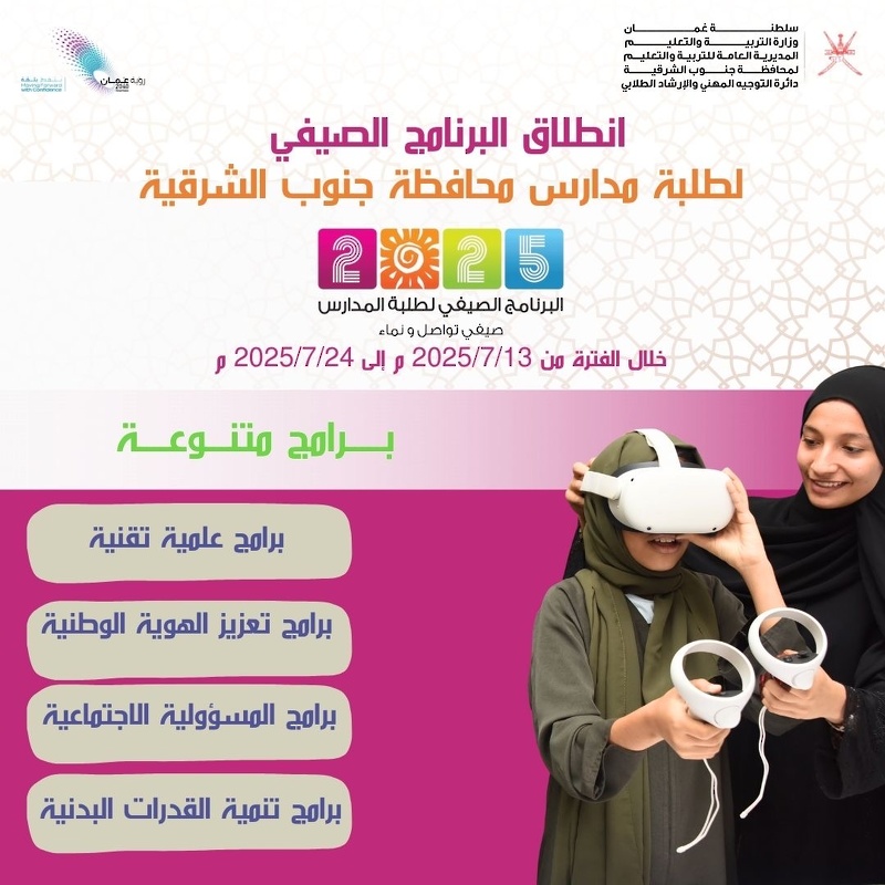 تنطلق غدا فعاليات البرنامج الصيفي #صيفي_تواصل_ونماء 2025 والذي تنظمه وزارة التربية والتعليم بمحافظات السلطنة ويستمر أسبوعين.