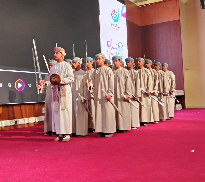 وبعد ذلك تم تقديم الإنشاد بعنوان أنغام التميز وهو من كلمات الشاعر عوض بن سعيد الشكيلي وأداء المعلم عادل بن محمد النزواني وطلبة مدرسة المرتفع للتعليم الأساسي .