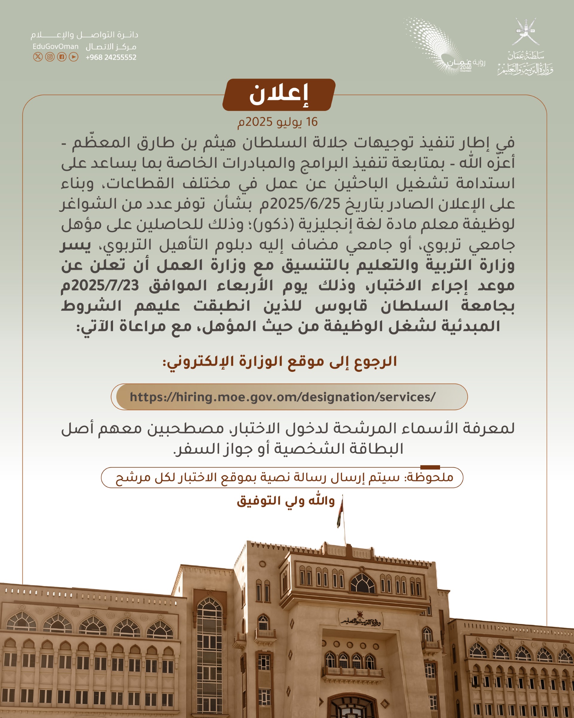 لمعرفة الإسماء المرشحة لدخول اختبار التوظيف لمادة اللغة الإنجليزية (ذكور) https://hiring.moe.gov.om/designation/services/